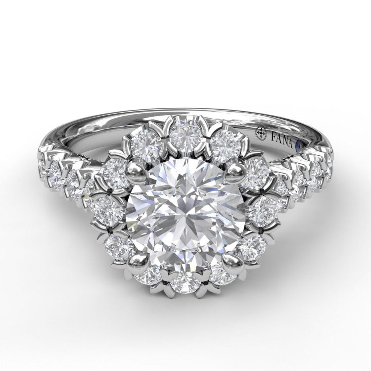 Take your engagement ring to the next level with a stunning border of diamonds that accentuates the perfection of the round diamond in this designer piece. This single row designer engagement ring is available in can be special ordered in any finger size, in Platinum, 18KT & 14KT gold and can be customized for any shape and size centerstone.