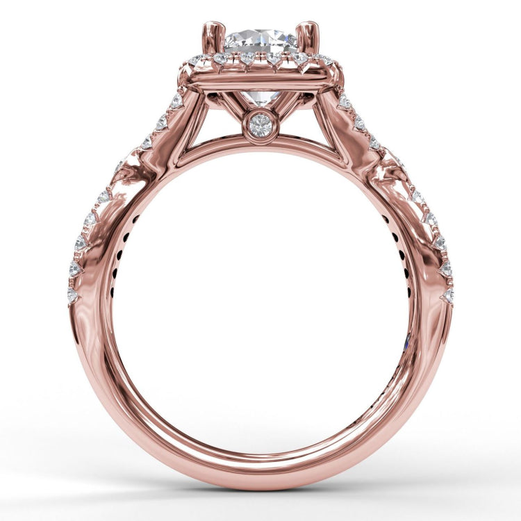 This distinct engagement ring features a diamond twist shank accented by a bezel-set diamond. Paired with a showstopping cushion halo, this style is the ultimate luxury bridal piece. This engagement ring can be special ordered in any finger size, in Platinum, 18KT & 14KT gold and can be customized for any shape and size centerstone.