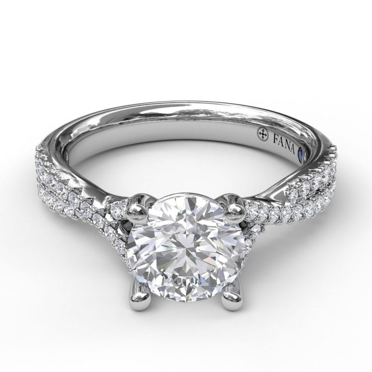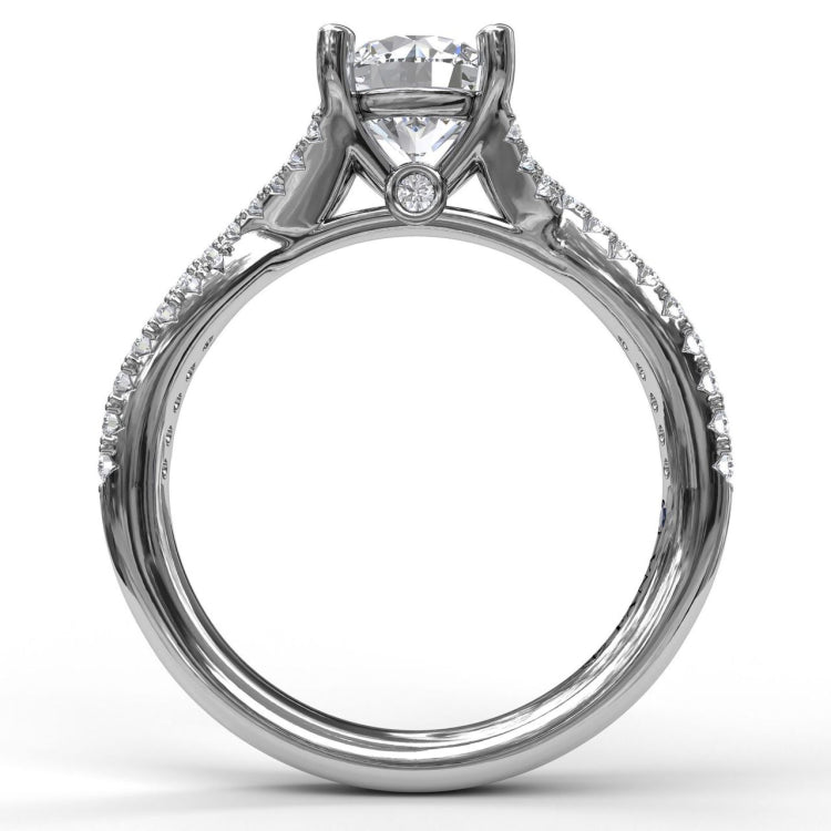 Two tightly overlapping bands laced with diamonds come together to offer additional shine to your engagement ring and further draw attention to your center diamond. This round cut and pave infinity band engagement ring can be special ordered in any finger size, in Platinum, 18KT & 14KT gold and can be customized for any shape and size centerstone.