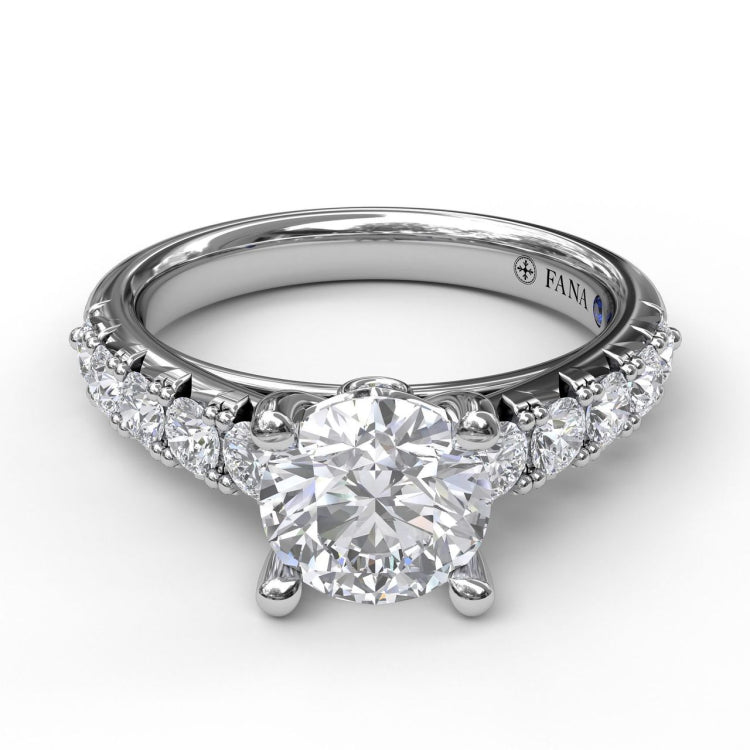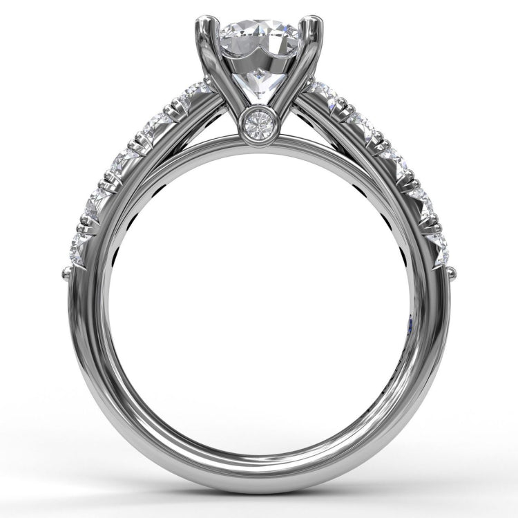 This engagement ring features a striking line of diamonds meticulously french-pave' set along the band for a marvelous view that wows from all directions. This gorgeous diamond engagement ring can be special ordered in any finger size, in Platinum, 18KT & 14KT gold and can be customized for any shape and size centerstone.