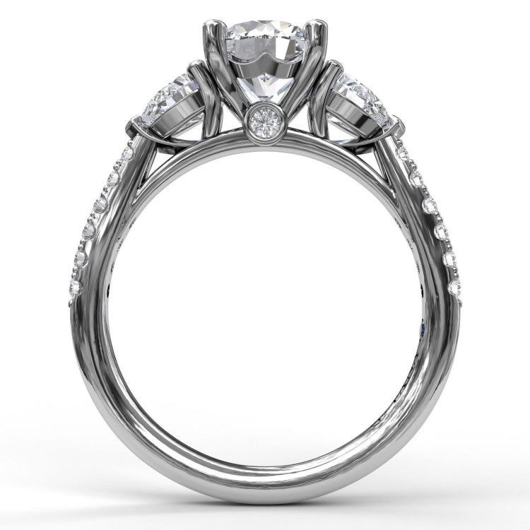 This three-stone engagement ring kicks the shine factor with pear shape side stones and a diamond-laced band that sweeps toward the graceful trio. This gorgeous three stone single row engagement ring can be special ordered in any finger size, in Platinum, 18KT & 14KT gold and can be customized for any shape and size centerstone.