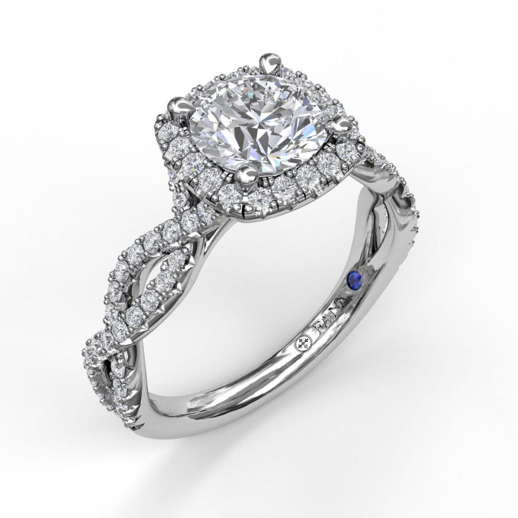 Two wondrous rows of diamonds intertwine as they approach the exquisite halo in this dashing, classic design. This halo engagement ring can be special ordered in any finger size, in Platinum, 18KT & 14KT gold and can be customized for any shape and size centerstone.