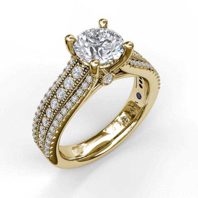 Three rows of diamonds of varying sizes in the channel of the band serve as the most brilliant of backdrops for the round center stone of this impressive engagement ring. Milgrain detailing adds an extra touch of sophistication and interest. This engagement ring can be special ordered in any finger size, in Platinum, 18KT & 14KT gold and can be customized for any shape and size centerstone.