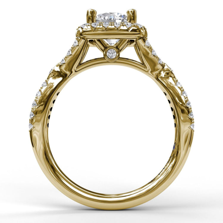 This distinct engagement ring features a diamond twist shank accented by a bezel-set diamond. Paired with a showstopping cushion halo, this style is the ultimate luxury bridal piece. This engagement ring can be special ordered in any finger size, in Platinum, 18KT & 14KT gold and can be customized for any shape and size centerstone.