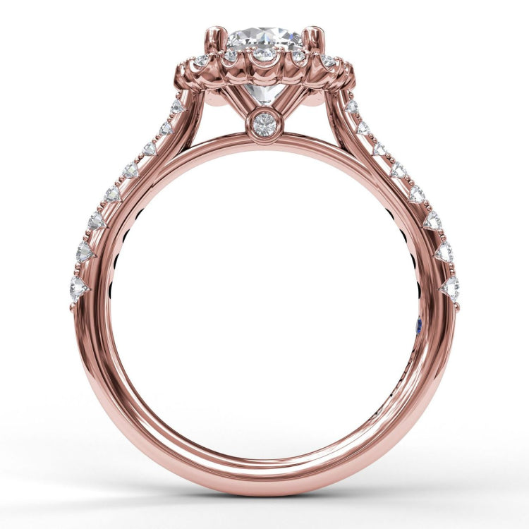 The beauty of this piece is found in its dainty scalloping halo, which makes this ring stand out with a fresh, lively feel. This delicate halo with pave band engagement ring can be special ordered in any finger size, in Platinum, 18KT & 14KT gold and can be customized for any shape and size centerstone.