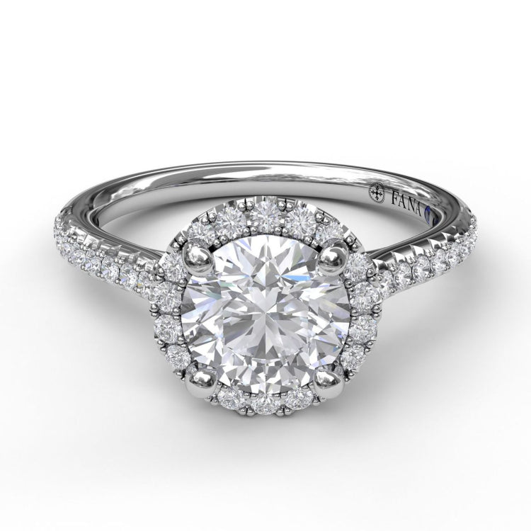 The beauty of this piece is found in its dainty round halo, which makes this ring stand out with a fresh, lively feel. This delicate round halo and pave band engagement ring can be special ordered in any finger size, in Platinum, 18KT & 14KT gold and can be customized for any shape and size centerstone.