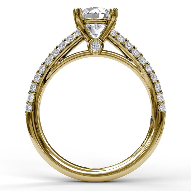 The diamond-encrusted knife edge detail of this band creates a strong line that draws your eyes to the center stone, highlighting and adding to its beauty and forming a chic standout ring you'll love for years to come. This stunning diamond engagement ring can be special ordered in any finger size, in Platinum, 18KT & 14KT gold and can be customized for any shape and size centerstone.