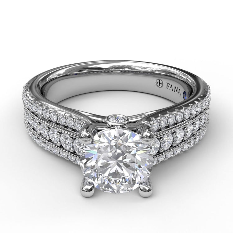 Three rows of diamonds of varying sizes in the channel of the band serve as the most brilliant of backdrops for the round center stone of this impressive engagement ring. Milgrain detailing adds an extra touch of sophistication and interest. This engagement ring can be special ordered in any finger size, in Platinum, 18KT & 14KT gold and can be customized for any shape and size centerstone.
