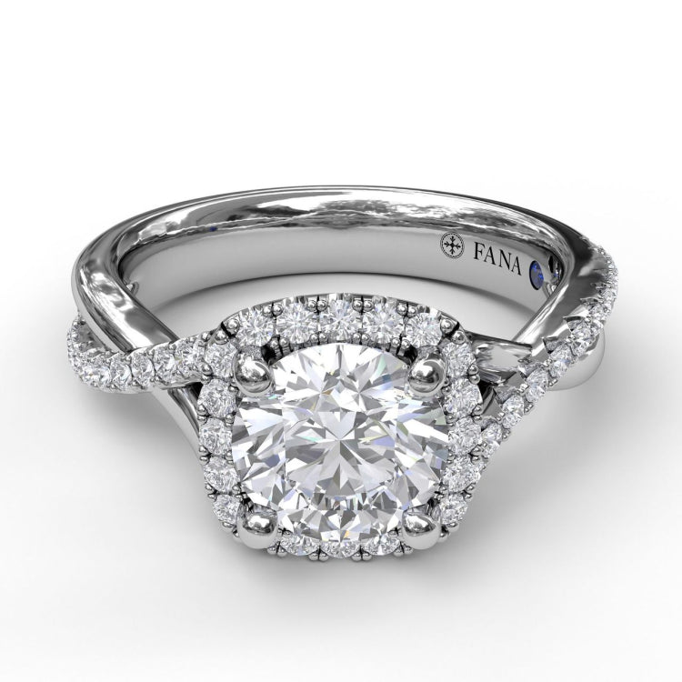 This contemporary style is decorated with pave diamonds along the twisting band and in the cushion-shaped halo, which cradles the brilliant round cut center diamond. This round cut with cushion halo engagement ring can be special ordered in any finger size, in Platinum, 18KT & 14KT gold and can be customized for any shape and size centerstone.