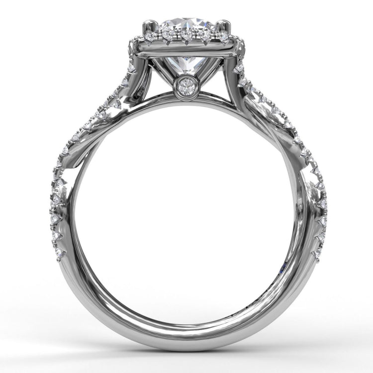 Two wondrous rows of diamonds intertwine as they approach the exquisite halo in this dashing, classic design. This halo engagement ring can be special ordered in any finger size, in Platinum, 18KT & 14KT gold and can be customized for any shape and size centerstone.