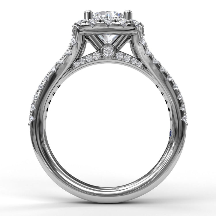 Cushion Halo Engagement Ring with a Diamond Encrusted Split Band