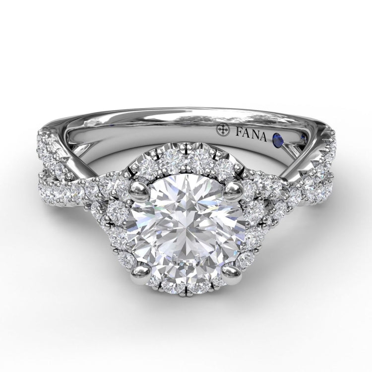 Two wondrous rows of diamonds intertwine as they approach the exquisite halo in this dashing, classic design. This halo engagement ring can be special ordered in any finger size, in Platinum, 18KT & 14KT gold and can be customized for any shape and size centerstone.