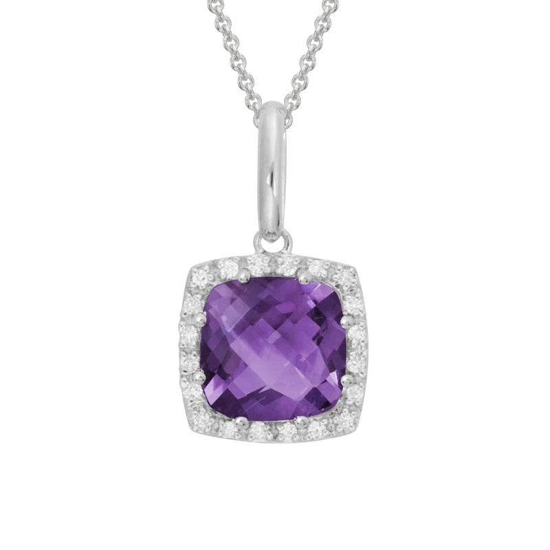 14 Karat White Gold 8MM Checkered Amethyst 20 Diamonds = 0.10 Carat Halo Pendant with 16-18" Chain