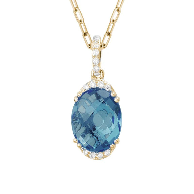 14 Karat Yellow Gold Checkered 13x8mm Blue Topaz 13 Diamonds = 0.06 Carat Halo Pendant includes 18" Chain with Lobster Clasp