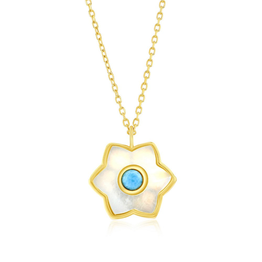 Sterling Silver, Larimar & MOP Flower Necklace - Gold Plated