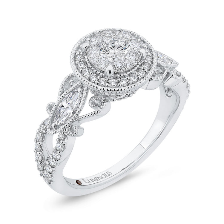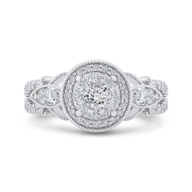 Diamond Halo Engagement Ring in 14K White Gold, Side Stone Shape: Round & Marquise, Side Stone Color: IJ, Side Stone: 61