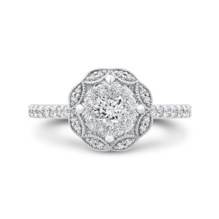 Diamond Flower Engagement Ring in 14K White Gold, Side Stone Shape: Round, Side Stone Color: IJ, Side Stone: 44