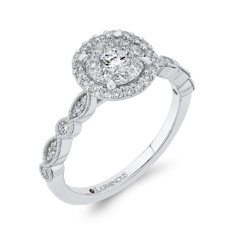 Diamond Halo Engagement Ring in 14K White Gold, Side Stone Shape: Round, Side Stone Color: IJ, Side Stone: 42