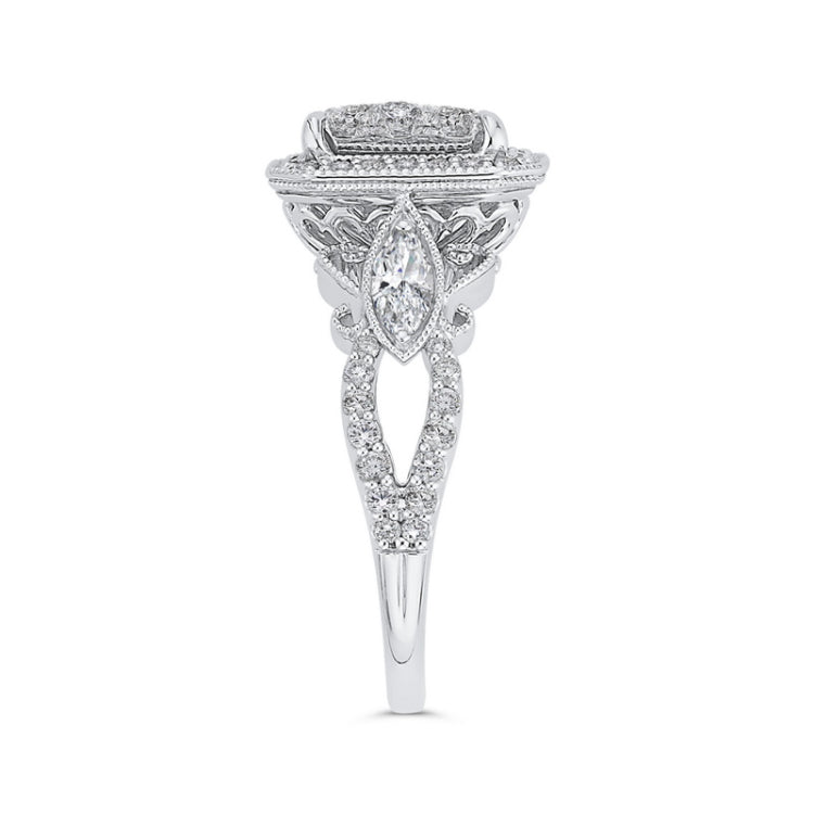 Round Diamond Halo Engagement Ring in 14K White Gold, Side Stone Shape: Round & Marquise, Side Stone Color: IJ, Side Stone: 65
