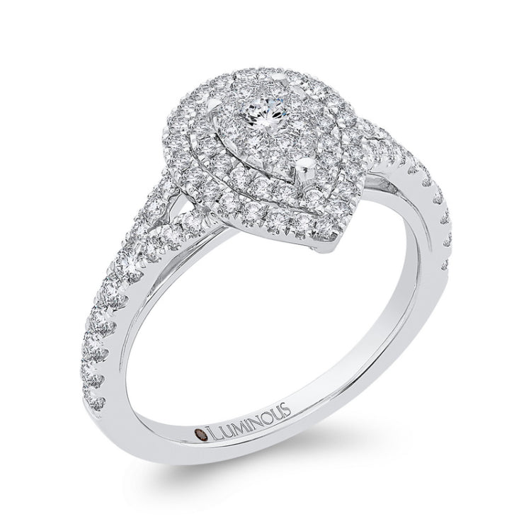 Split Shank Round Diamond Pear Shape Double Halo Engagement Ring in 14K White Gold