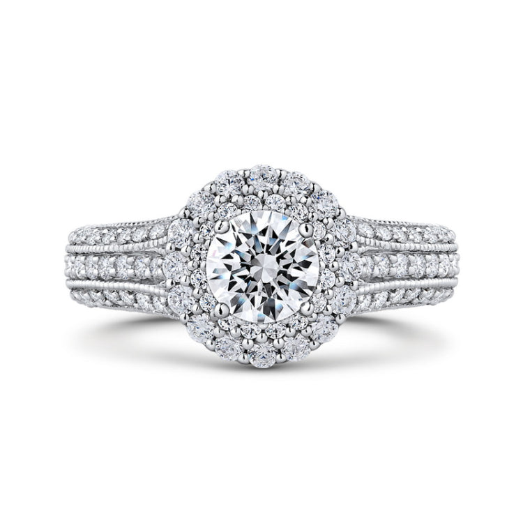 Diamond Double Halo Vintage Engagement Ring in 14K White Gold, Side Stone Shape: Round, Side Stone Color: GH, Side Stone: 108