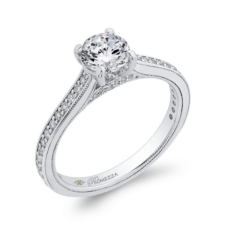 Round Diamond Cathedral Style Engagement Ring in 14K White Gold, Side Stone Shape: Round, Side Stone Color: GH, Side Stone: 42