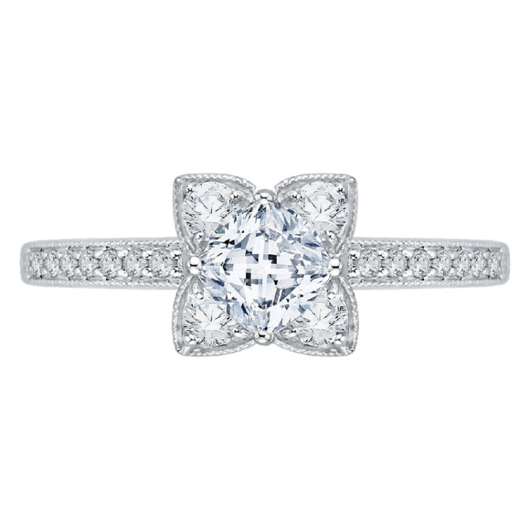 Cushion Cut Diamond Floral Engagement Ring in 14K White Gold