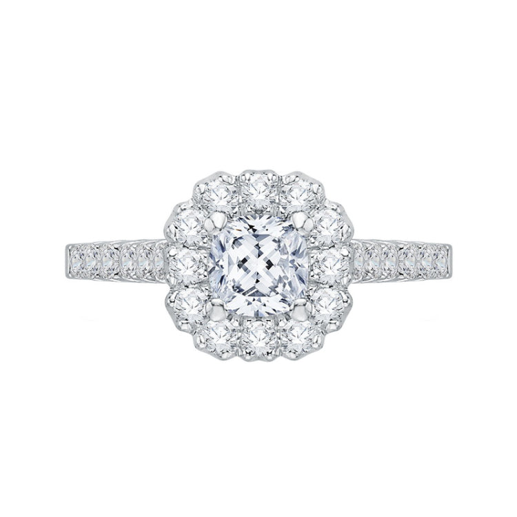 Cushion Cut Diamond Halo Engagement Ring in 14K White Gold, Side Stone Shape: Round, Side Stone Color: GH, Side Stone: 34