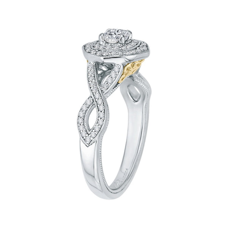 Cushion Cut Diamond Double Halo Engagement Ring in 14K Two Tone Gold, Side Stone Shape: Round, Side Stone Color: GH, Side Stone: 87
