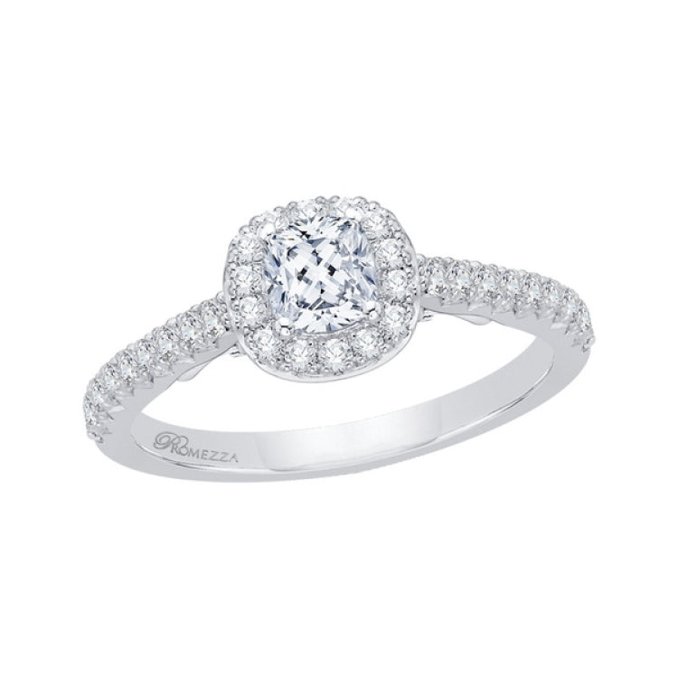 Cushion Cut Diamond Halo Engagement Ring in 14K White Gold, Side Stone Shape: Round, Side Stone Color: GH, Side Stone: 34