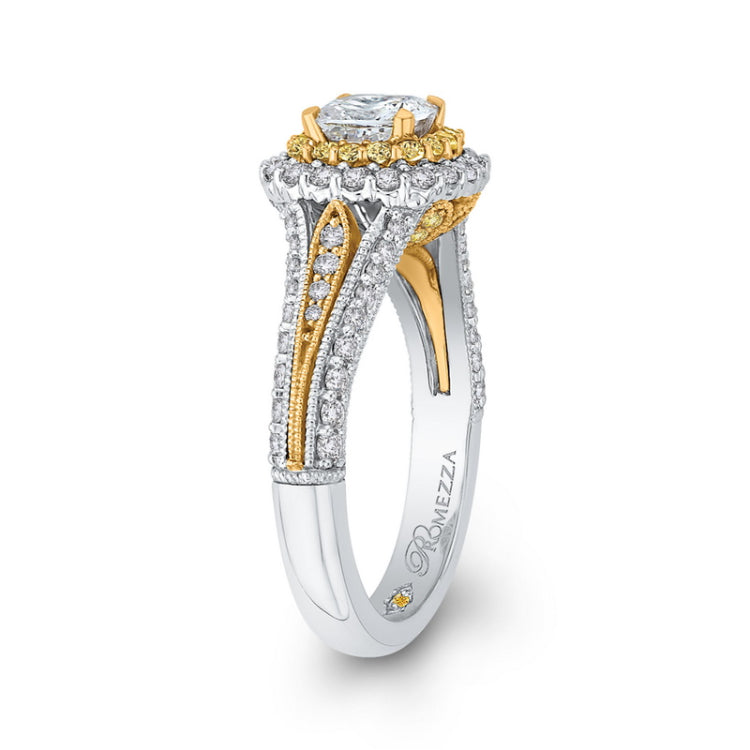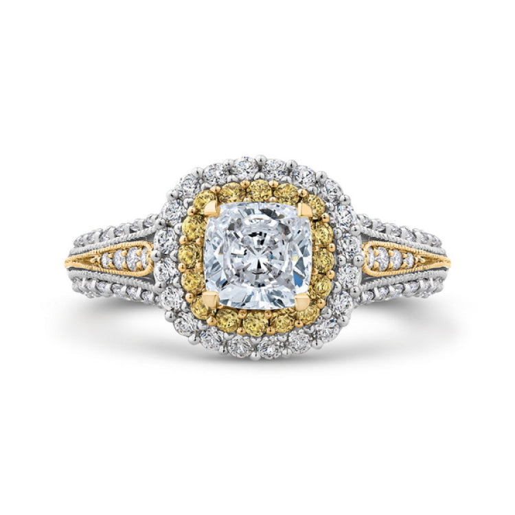 Split Shank Cushion Cut Diamond Double Halo Engagement Ring in 14K Two Tone Gold