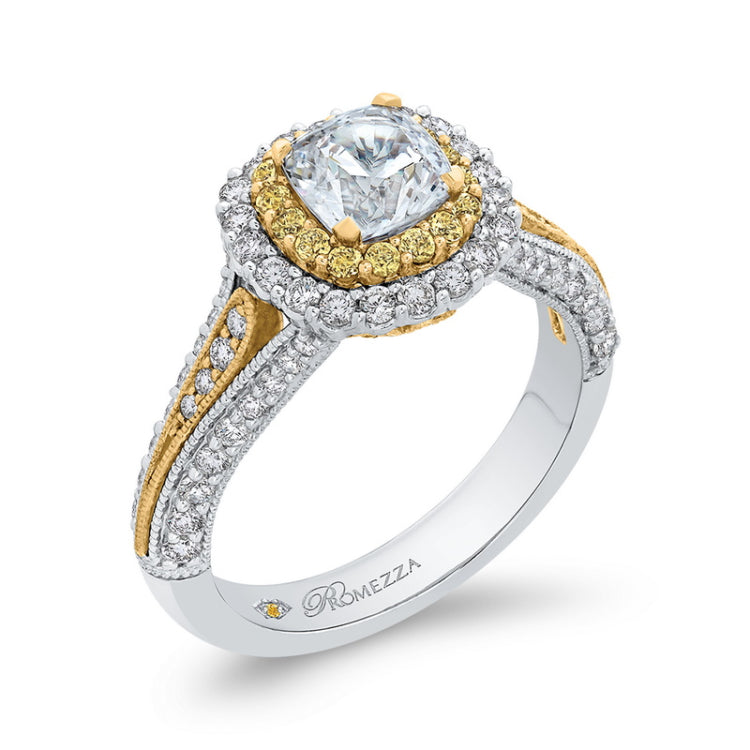 Split Shank Cushion Cut Diamond Double Halo Engagement Ring in 14K Two Tone Gold, Side Stone Shape: Round, Side Stone Color: GH, Side Stone: 94