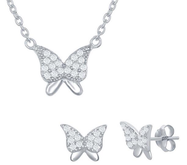 Sterling Silver 14+2" Cubic Zirconia Butterfly Necklace and Earring Set