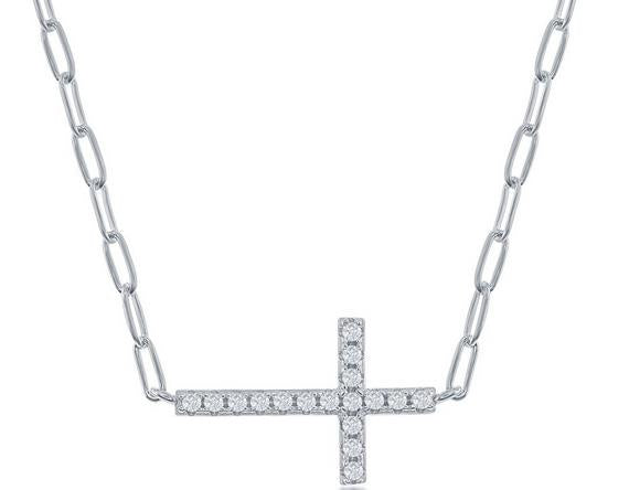 Sterling Silver 16+2" Cubic Zirconia Sideways Cross Paperclip Necklace