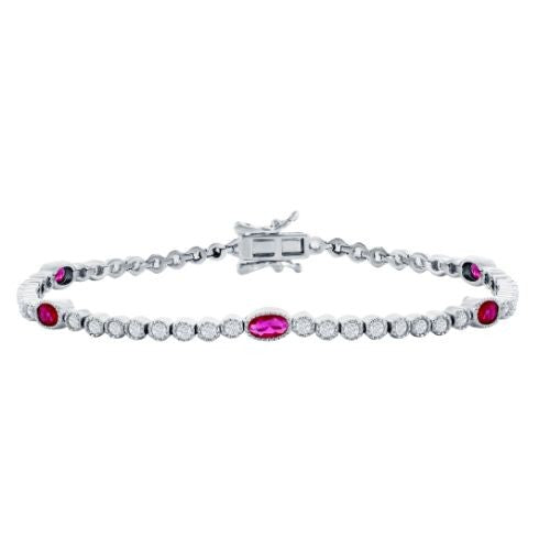 Sterling Silver Beaded Outline Round & Oval Ruby Cubic Zirconia Bracelet 7.25"