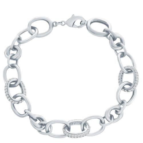 Sterling Silver Micro Pave Cubic Zirconia & Polished Oval Link Bracelet 7.25"