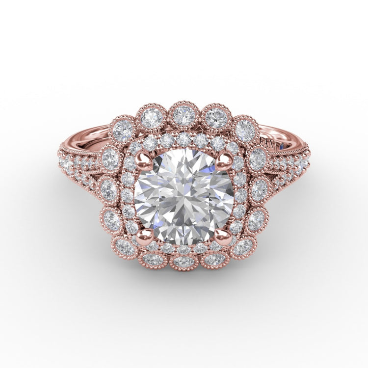 Richly detailed with all-over milgrain edges, this double halo engagement ring feels like a romantic fairytale with its lacy canopy of bezel-set round diamonds and elegant split shank. Available in platinum, 18KT & 14KT gold. Customize this design with an Authorized Fana Retailer.
