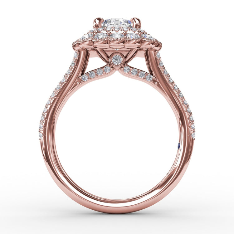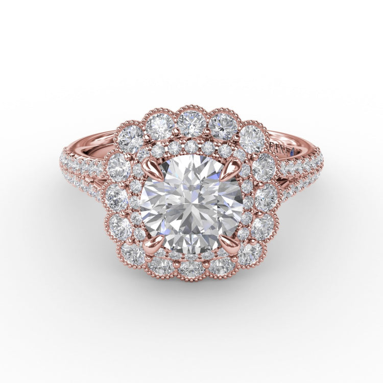 Richly detailed with all-over milgrain edges, this engagement ring feels like a romantic fairytale with its pavé and scalloped halos, and elegant diamond split shank. Available in platinum, 18KT & 14KT gold. Customize this design with an Authorized Fana Retailer.