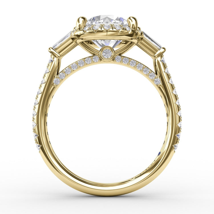 Beautifully elongated and tapered baguette side stones offset this round diamond halo engagement ring with a touch of Art Deco-inspired elegance and flair. It’s a regal style with tremendous height and stature, perfect for brides who want a classic, romantic look with lots of glamorous sparkle. Available in platinum, 18KT & 14KT gold. Customize this design with an Authorized Fana Retailer.