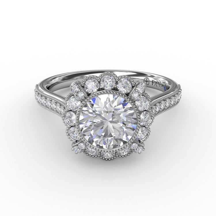 All-over milgrain edges define this vintage-inspired style, from the bezel-set center stone to the elegant band. Like little sunrays, prong-set diamonds interrupt the scalloped halo at four key points—an unexpected detail that also adds extra sparkle. Available in platinum, 18KT & 14KT gold. Customize this design with an Authorized Fana Retailer.