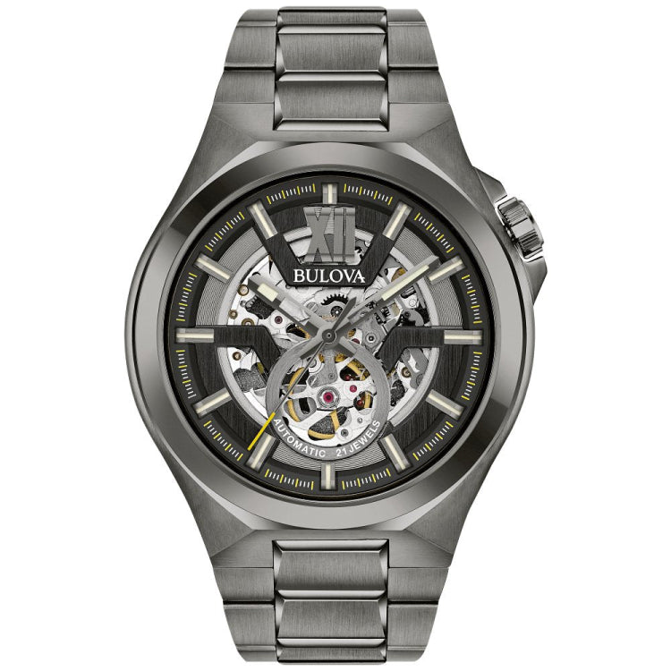 From the Classic Automatic Collection. New Sport style in gunmetal IP stainless steel case, open aperture black dial with silver-tone accents and black inner dial ring, exhibition case back, skeleton automatic movement with 40-hour power reserve, sapphire glass, gunmetal IP stainless steel bracelet with double-press deployment closure, and water resistance to 100 meters.