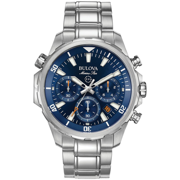 From the Marine Star Collection. Six hand calendar chronograph in stainless steel with silver-tone finish and blue dial, flat mineral glass, screw-back case, and fold-over closure with pushers, safety bar and extender.