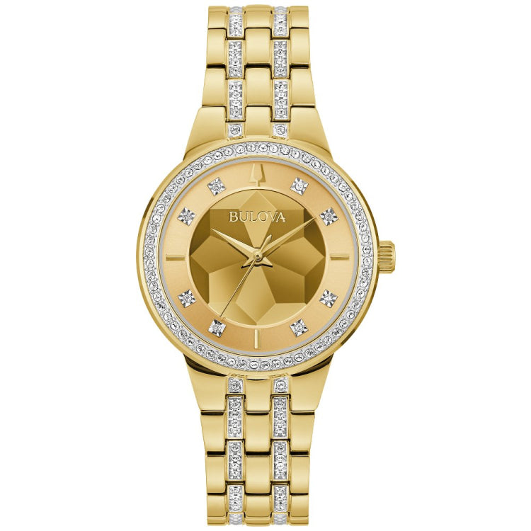 A truly captivating masterpiece, this Bulova ladies’ timepiece from the Crystal collection has an ingeniously beautiful dial that is sure to dazzle. Embellished with 112 crystals, the gold-tone stainless steel case and bracelet deliver a stunningly luxurious wrist presence, with a flat mineral crystal offering an uninterrupted view of the magnificent dial. The champagne dial features a faceted motif, with gold-tone accents and hands and 8 sparkling crystal hour markers. The matching gold-tone stainless steel bracelet features a slim foldover closure that maintains the timepiece’s sleek silhouette. Glisten at every angle with this elegant Bulova ladies’ timepiece.