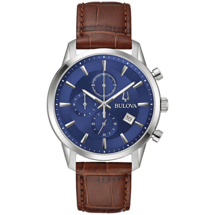 Timeless design and modern functionality define this new 6-hand Bulova men’s chronograph from the Sutton Collection. A refined silver-tone stainless steel case with a blend of brushing and polishing features classically styled chronograph pushers and a domed mineral crystal. The attractive blue dial features applied hour markers against a circular grooved track, luminescent hour and minute hands, and a date display. The chronograph can time events up to 12 hours to the nearest second. Perfectly paired with a brown crocodile grain leather strap with a matching silver-tone stainless steel deployant clasp. This new Bulova men’s timepiece from the Sutton Collection will have you looking your best for every occasion.