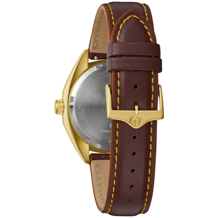 Straight from the 1970s comes the Bulova 1973 Jet Star “F”, an iconic model from the brands impressive history, now equipped with an equally impressive movement. Borrowing from its historic forebear, the gold-tone stainless steel case features a striking angular design with broad facets and a domed sapphire crystal. The warmth of the butterscotch sunburst dial is accented by a rich brown chapter ring, applied brown and gold-tone hour markers, and gold tone hands. Luminescent plots at each hour and fill in the hands allow for exceptional legibility in every environment, while a date display sits perfectly at 3 o’clock. A red seconds hand brings a pop of color and sweeps smoothly around the dial thanks to Bulova’s Precisionist movement, a revolutionary 8-jewel quartz mechanism vibrating at a remarkable 262kHz and accurate to 5 seconds per month with increased resistance to temperature changes.