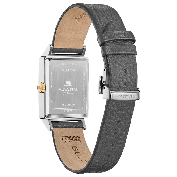 Incorporating vintage Bulova designs with the unmistakable elements of legendary performer, Frank Sinatra, the ‘My Way’ watch features a stainless steel rectangular case with a black dial, gold-tone hands and markers. Frank Sinatra’s signature is displayed under the Bulova logo and his iconic Fedora hat is etched on the gold-tone crown, as well as on the caseback along with the name, ‘My Way’. A distinct second hand sub sweep adds an elegant touch. The gray textured leather strap features a deployant buckle and is stamped with ‘My Way’ along the inside. Watch features a curved sapphire crystal and water resistance to 30 meters.