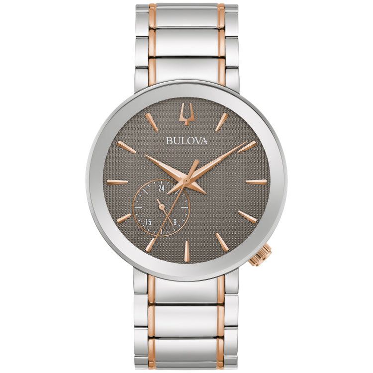 This new Bulova men’s timepiece adds to the Latin GRAMMY® Collection and continues the brand’s celebration of the awards show and the remarkable artists that make it possible. An edge-to-edge, curved metalized sapphire crystal creates an exceptionally modern 42mm case, which features silver-tone stainless steel and a rose gold-tone crown. The textured dial is accented with rose gold-tone hands and markers and a 24-hour sub-dial. On the back of the watch, the screw-back case is stamped with Latin GRAMMY® logo. The watch is paired perfectly with a matching two-tone bracelet with a deployant clasp. Bring the spirit of the Latin GRAMMY® awards and its incredible artists with this new Bulova men’s timepiece.