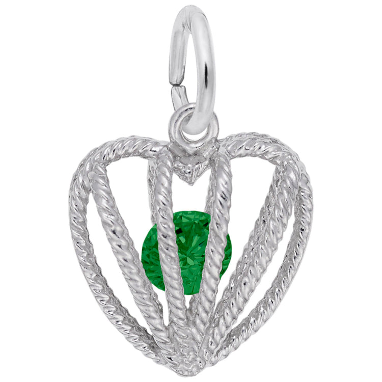 The Embraced With Love Stone Charm cages in the birth month's colored stone. This beautiful heart charm is full of love for the month of May. Available in silver and gold.